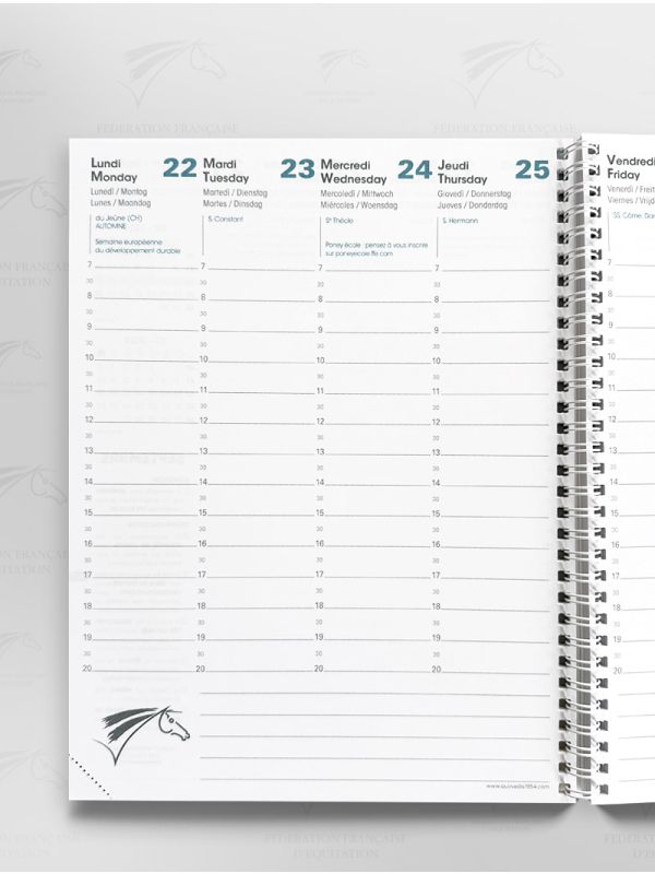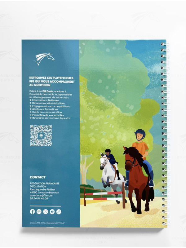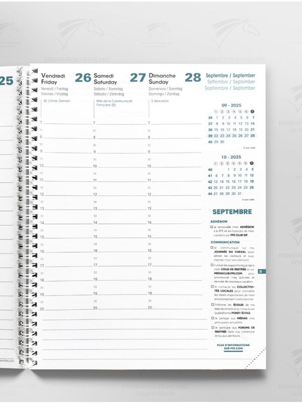 Agenda semainier de septembre 2025 à septembre 2026 avec des espaces de notes libres en bas de page, idéal pour avoir une vue globale de votre planning et de vos rendez-vous sur la semaine. À l’intérieur, découvrez les dates des événements organisés par la Fédération Française d’Équitation, les nouveautés proposées aux cavaliers licenciés, les rendez-vous clubs, les outils FFE et pleins d'autres informations utiles.
