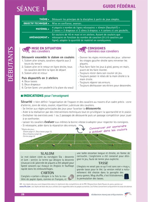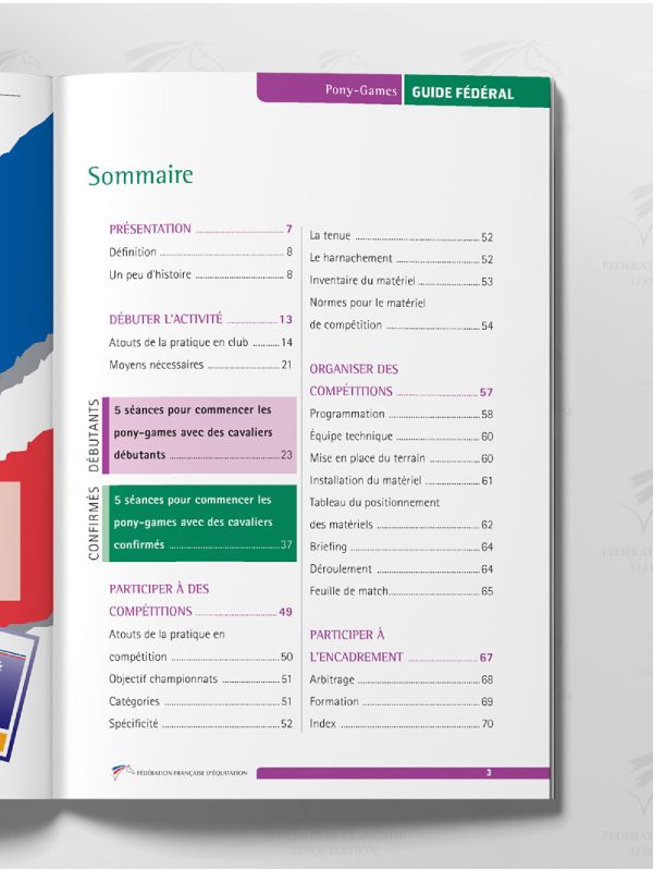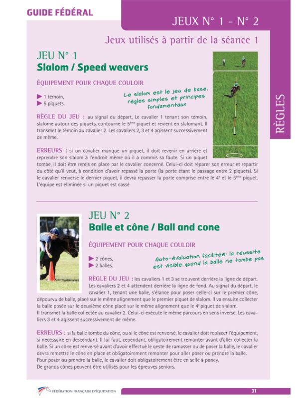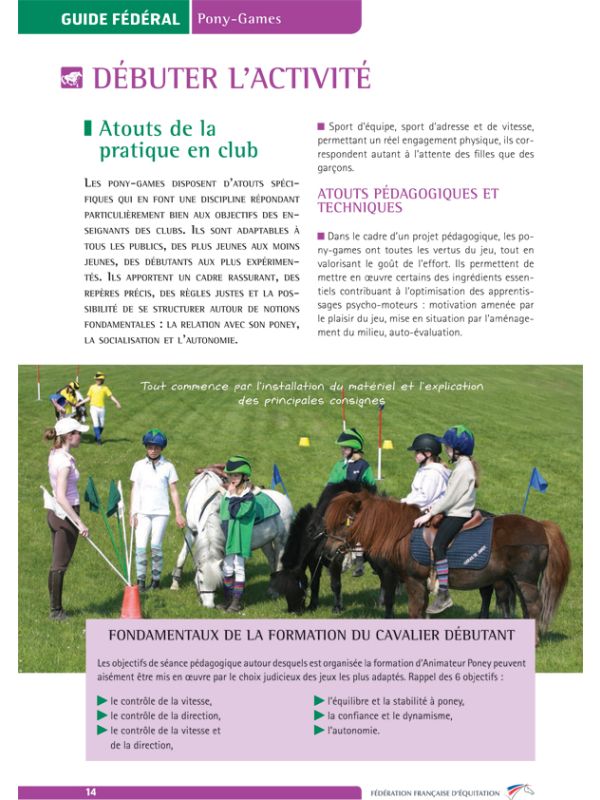 Le Guide Fédéral Pony-games réunit tout ce qu’il faut savoir sur la discipline des Pony-games, jeux effectués par équipe, à poney ou à cheval, dans des couloirs parallèles et en relais.