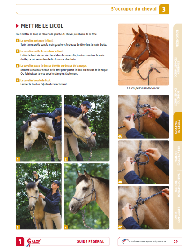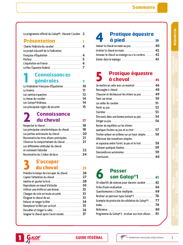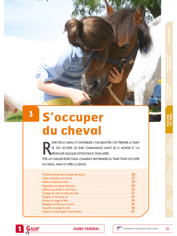 Réédité en 2017 avec de nouvelles pages et de nouveaux visuels, le premier des Guides fédéraux explique en 5 chapitres comment acquérir les connaissances et les savoir-faire qui permettent de devenir cavalier. Les 5 chapitres, illustrés de nombreux dessins et photos, expliquent les bonnes pratiques qui permettent de devenir cavalier (Avec des QCM pour s’auto-évaluer).